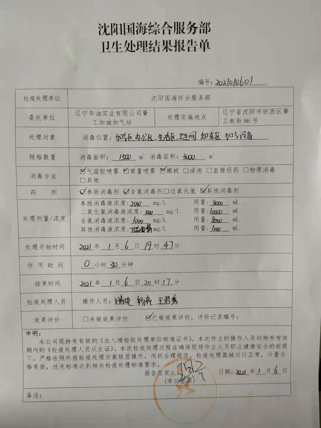 由于12月26日有新冠肺炎确诊病例出租车,在肇工站加气,按照防疫要求,肇工站原班组人员已全部居家隔离!且我公司于2021年1月6日委托“沈阳国海综合服务部”,对肇工站进行全面消杀服务。现肇工站已经完成室内外全面消杀,完全达到安全使用环境要求,已正常营业,请各位司机朋友放心前来!